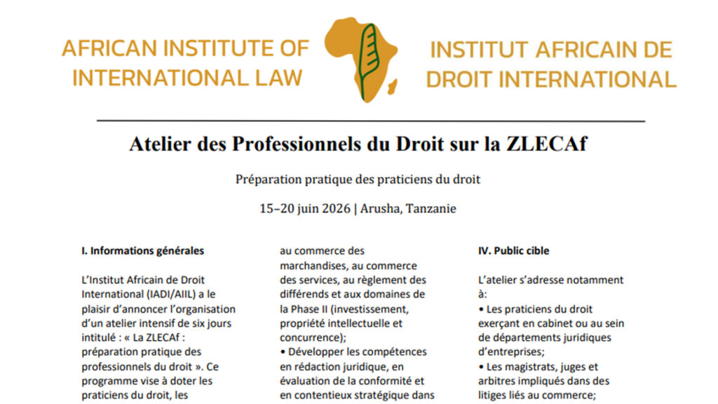 AfCFTA Legal Professionals Workshop: Practical Preparedness for Legal Practitioners20–25 April 2026 | Arusha, Tanzania This announcement provides details of a six-day AfCFTA Legal Professionals Workshop organized by the African Institute of International Law. The workshop focuses on practical legal skills related to the African Continental Free Trade Area, including trade in goods, services, dispute settlement, […]