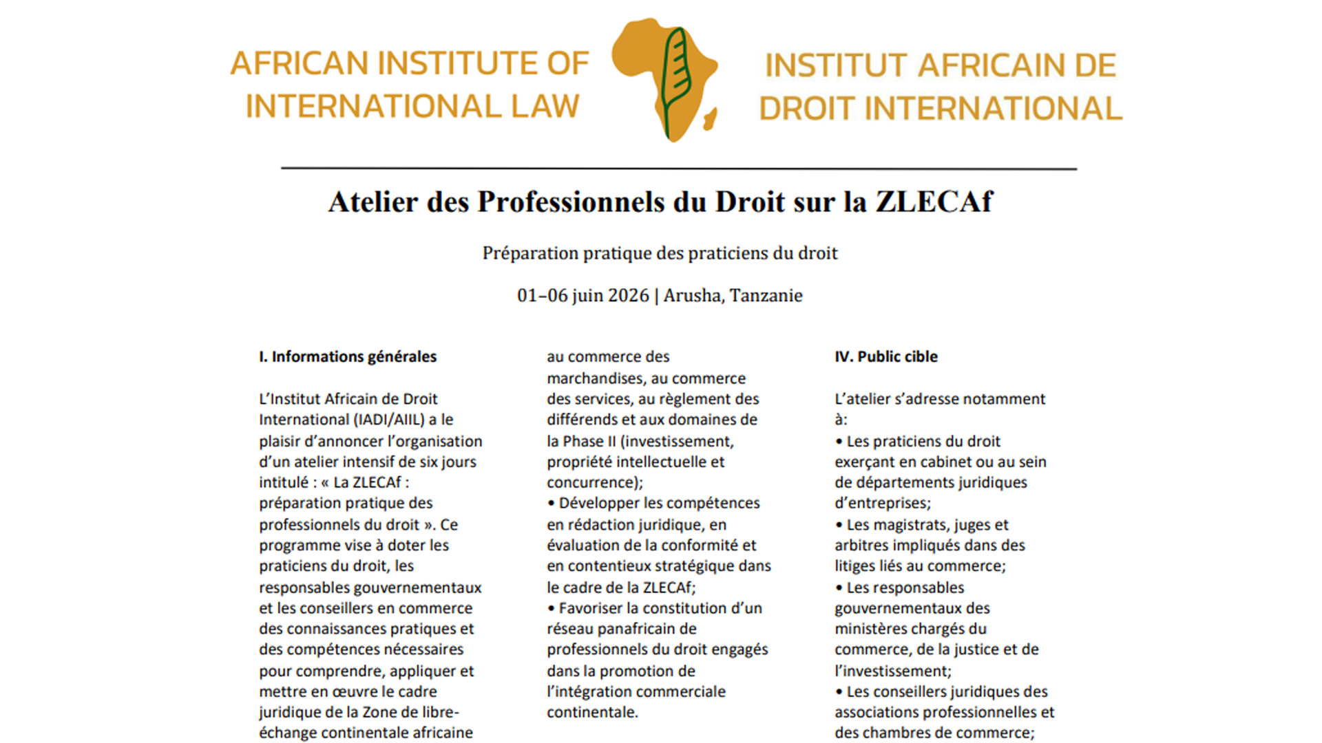 AfCFTA Legal Professionals Workshop: Practical Preparedness for Legal Practitioners20–25 April 2026 | Arusha, Tanzania This announcement provides details of a